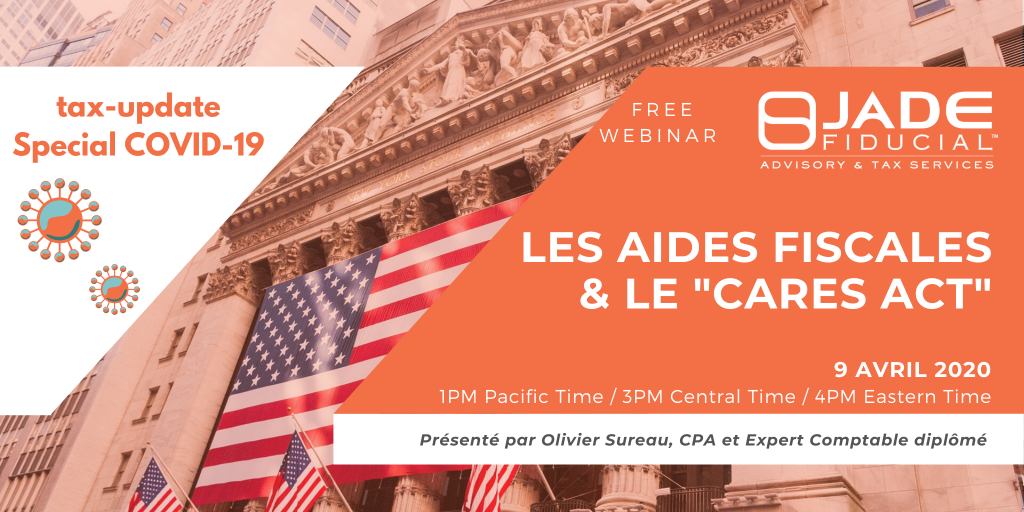 Donald Trump vient de signer un plan d’aide aux individus et aux entreprises historiquement élevé, afin de lutter contre les conséquences économiques dues à la pandémie du COVID-19. Cette loi prévoit plusieurs mesures et programmes d’aides pour les entreprises et pour les particuliers. Jade Fiducial vous propose un webinar en français de 45 minutes + questions / réponses afin de comprendre dans le détail, le programme mis en place par le gouvernement américain. Les sujets abordés seront: Quelles sont les aides fiscales mises en place pour les petites et moyennes entreprises par le C.A.R.E.S. Act ? Quelles sont les aides fiscales pour les particuliers ?