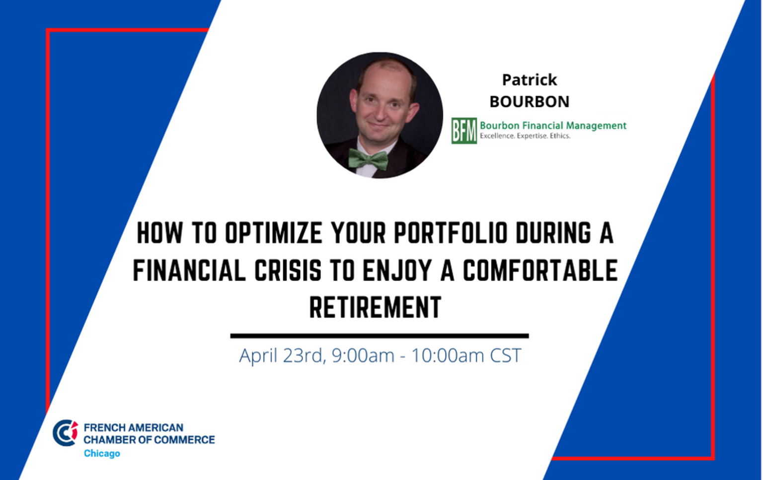 During this webinar Patrick Bourbon, CFA, CFP® of Bourbon Financial Management will discuss optimizing your wealth and retirement income, stocks, minimize taxes, health care, inflation, and foreign bank accounts. A Q&A will follow.